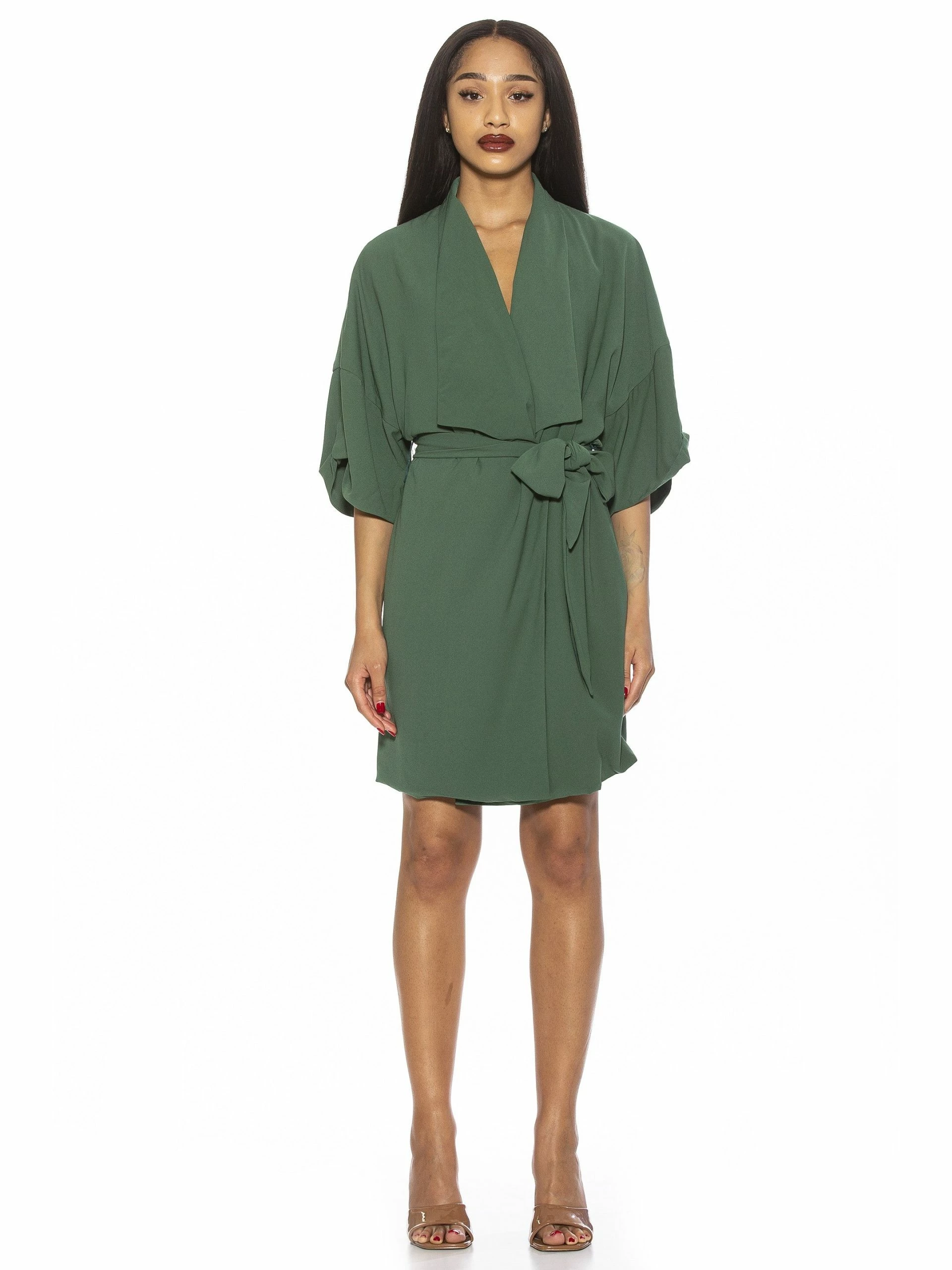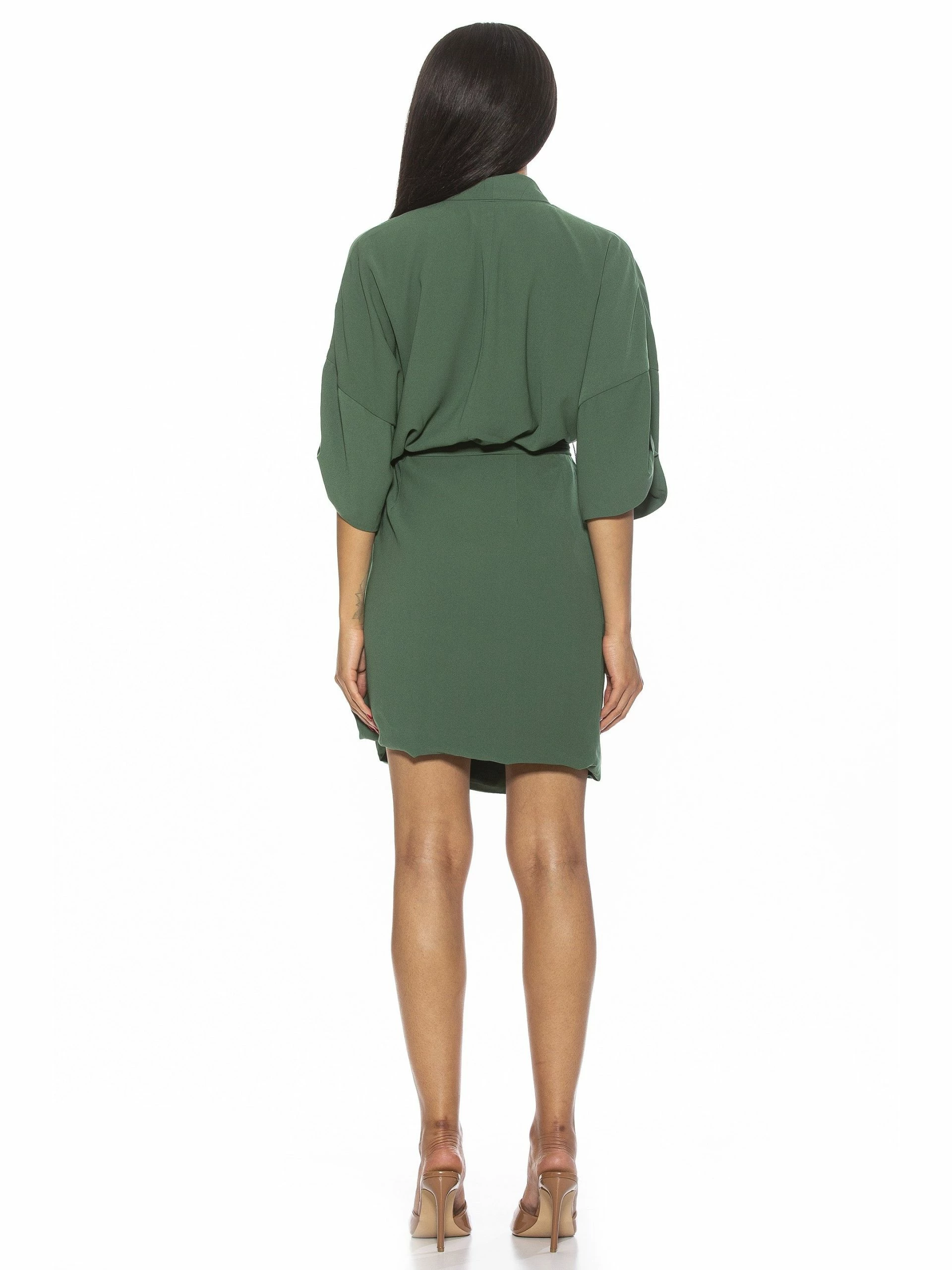 May cause compliments. The June is a 3/4 sleeve, mini dress with a collared neckline. The dress features a wrap skirt for a figure-flattering fit.