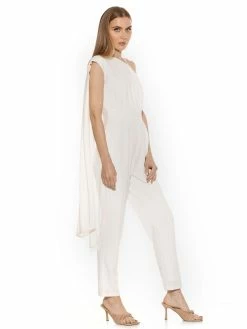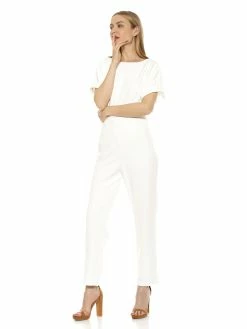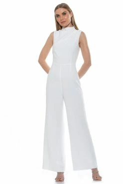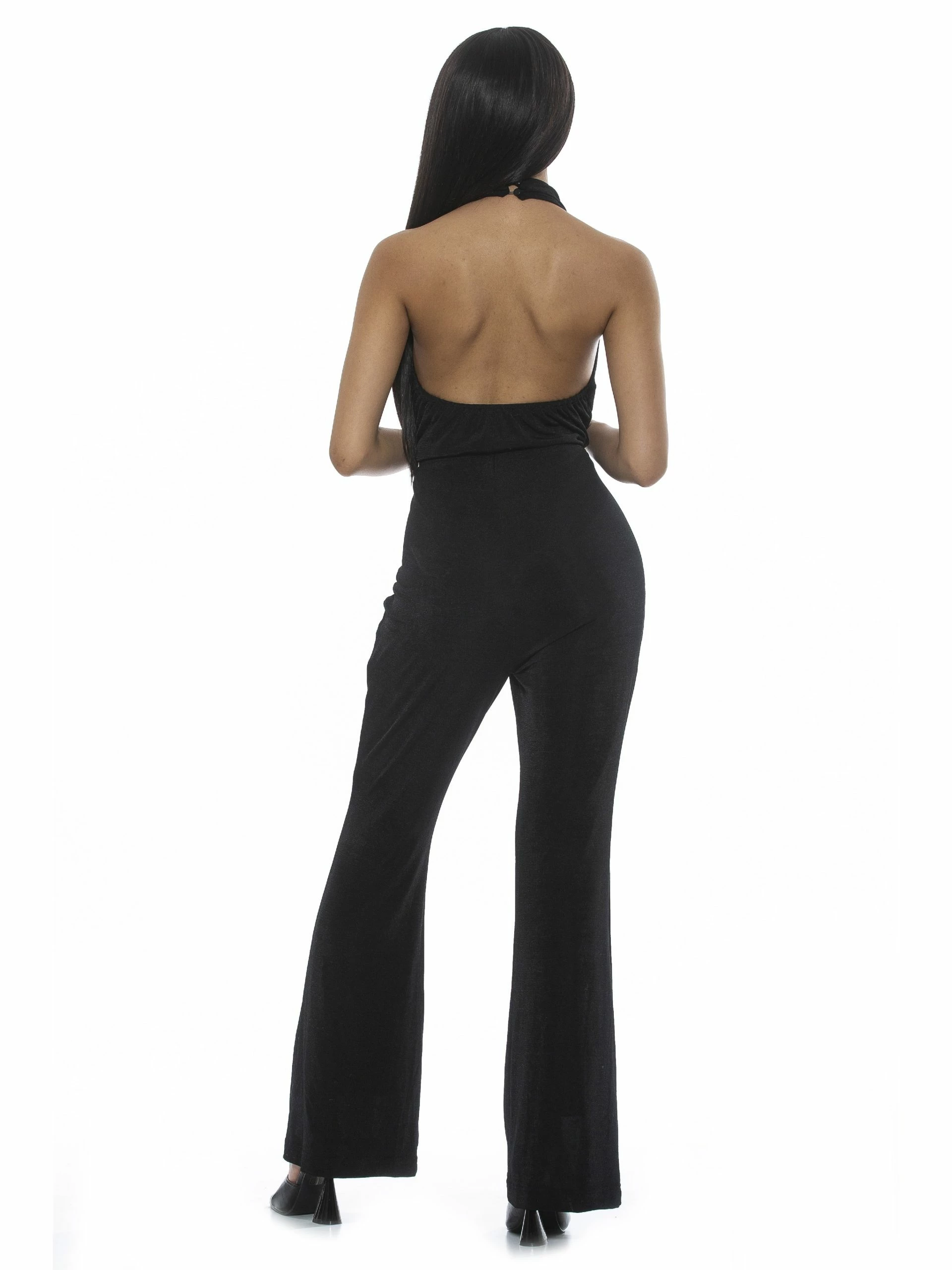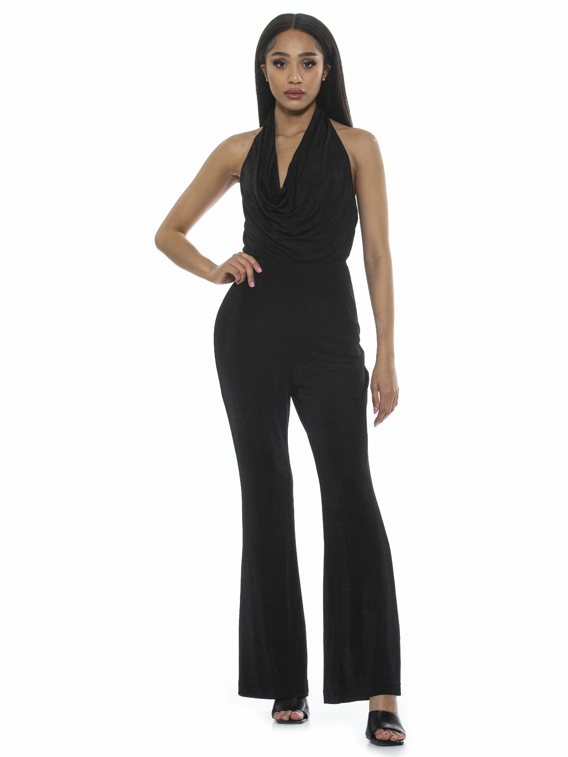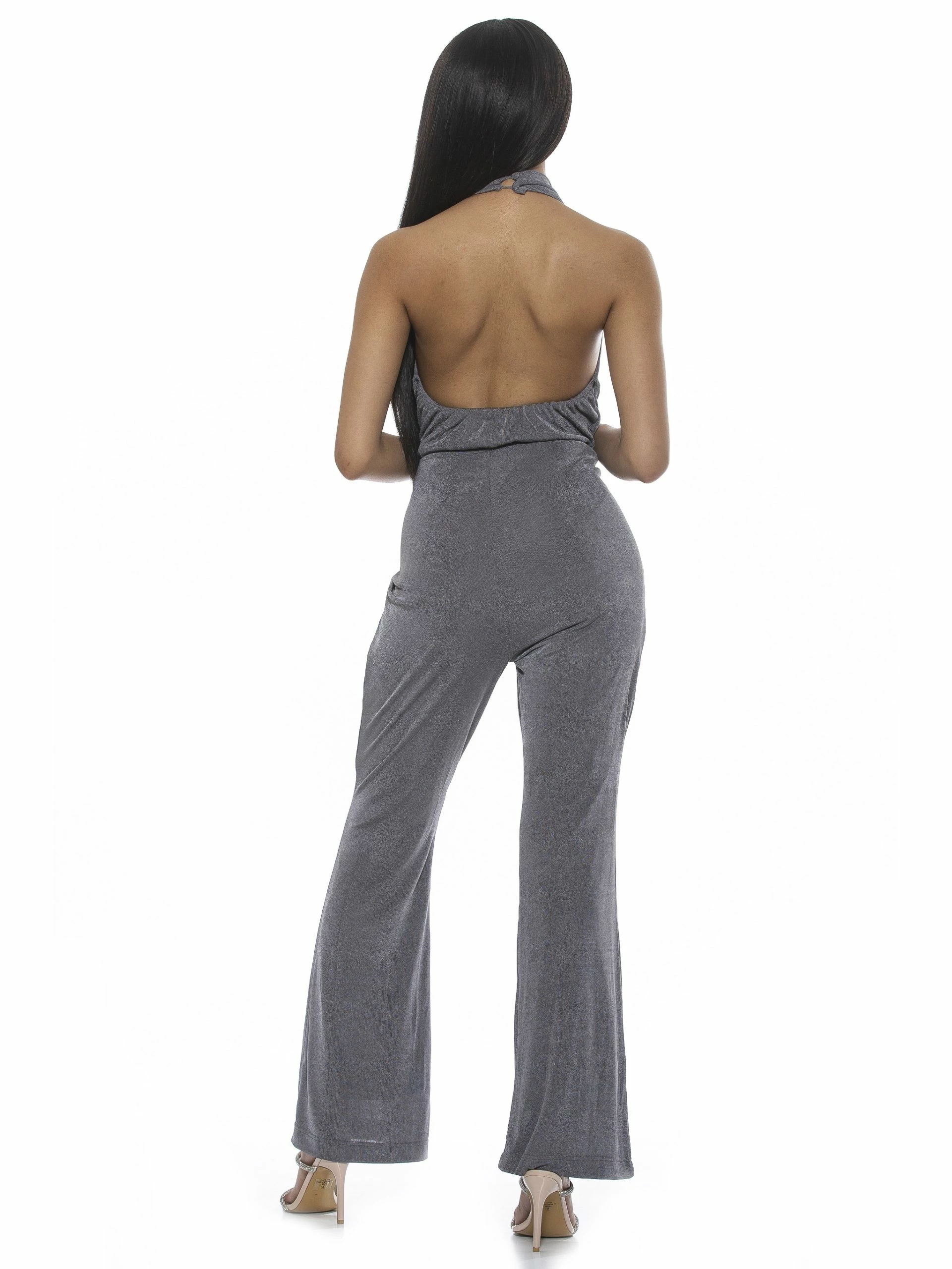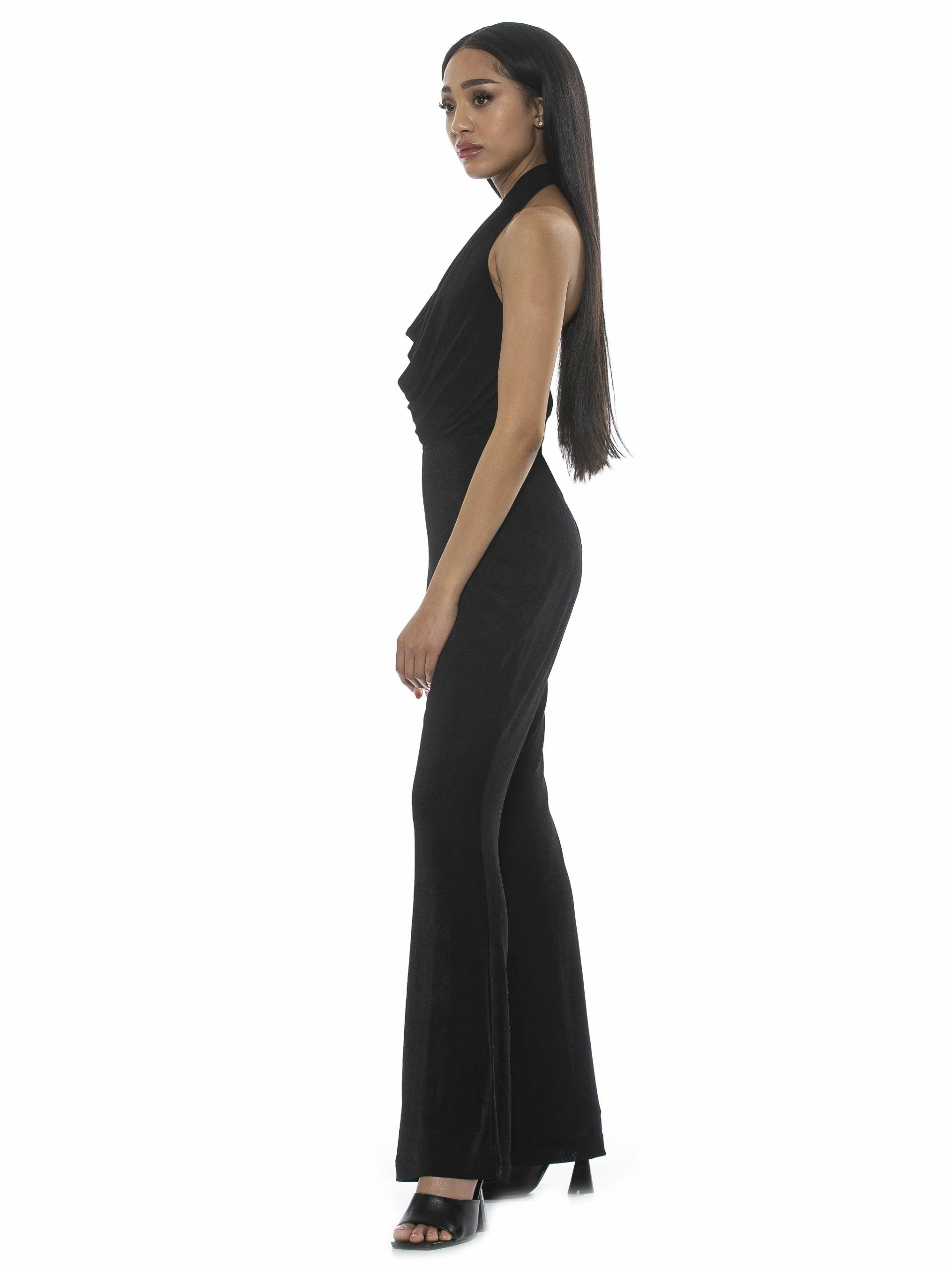 Don’t flirt with me. The Leilani is a backless jumpsuit, full-length bottoms with a slight bootcut and a cowl-halter neckline.Β