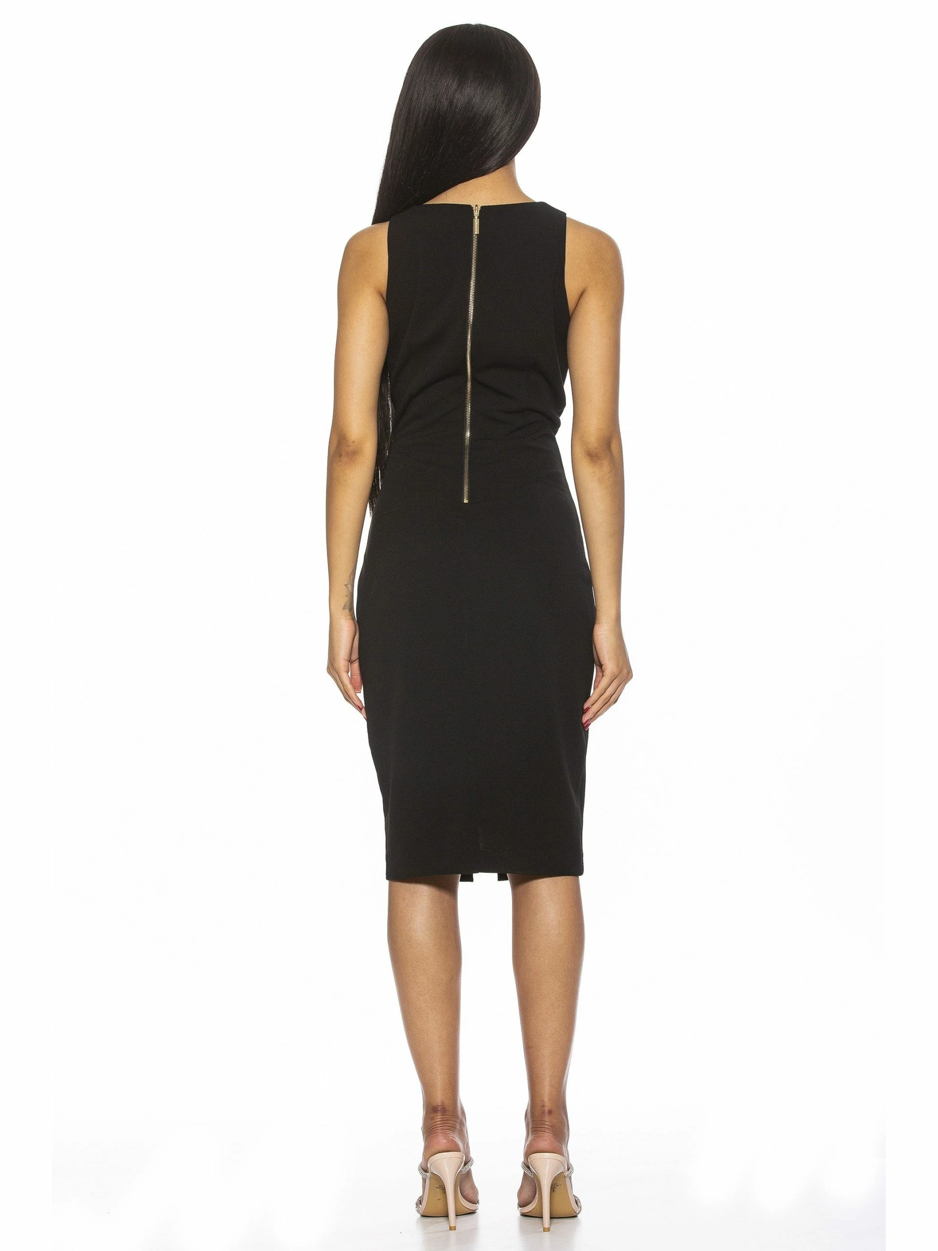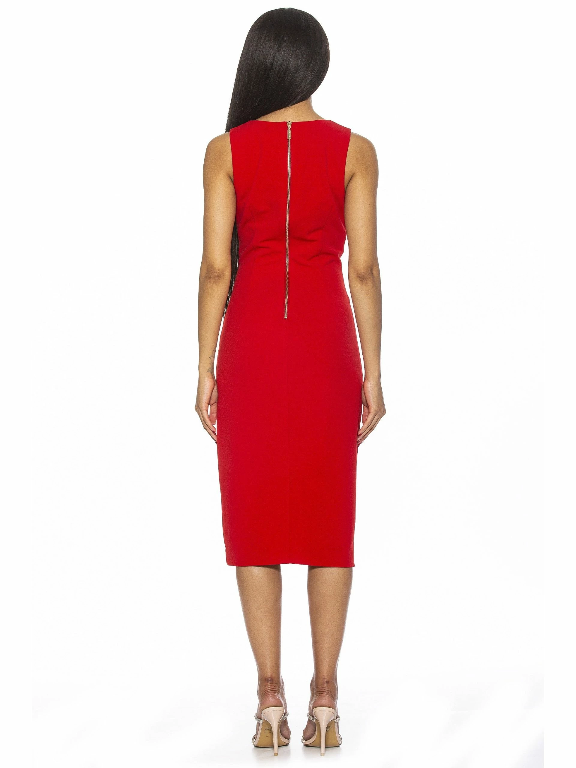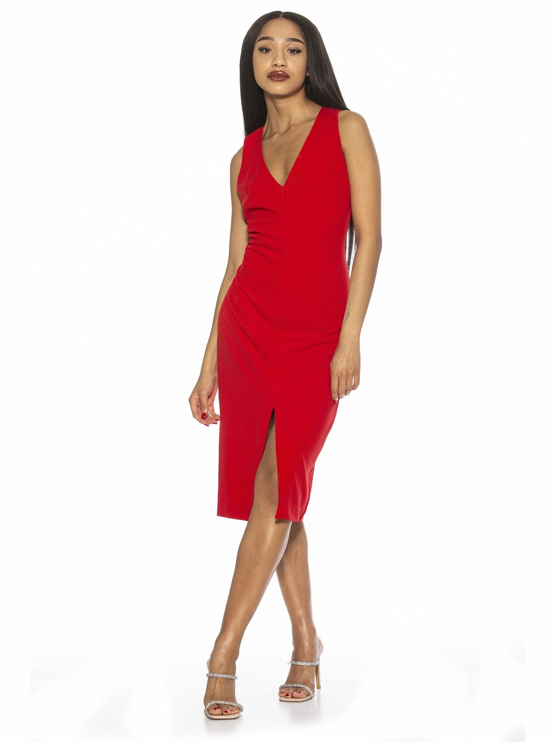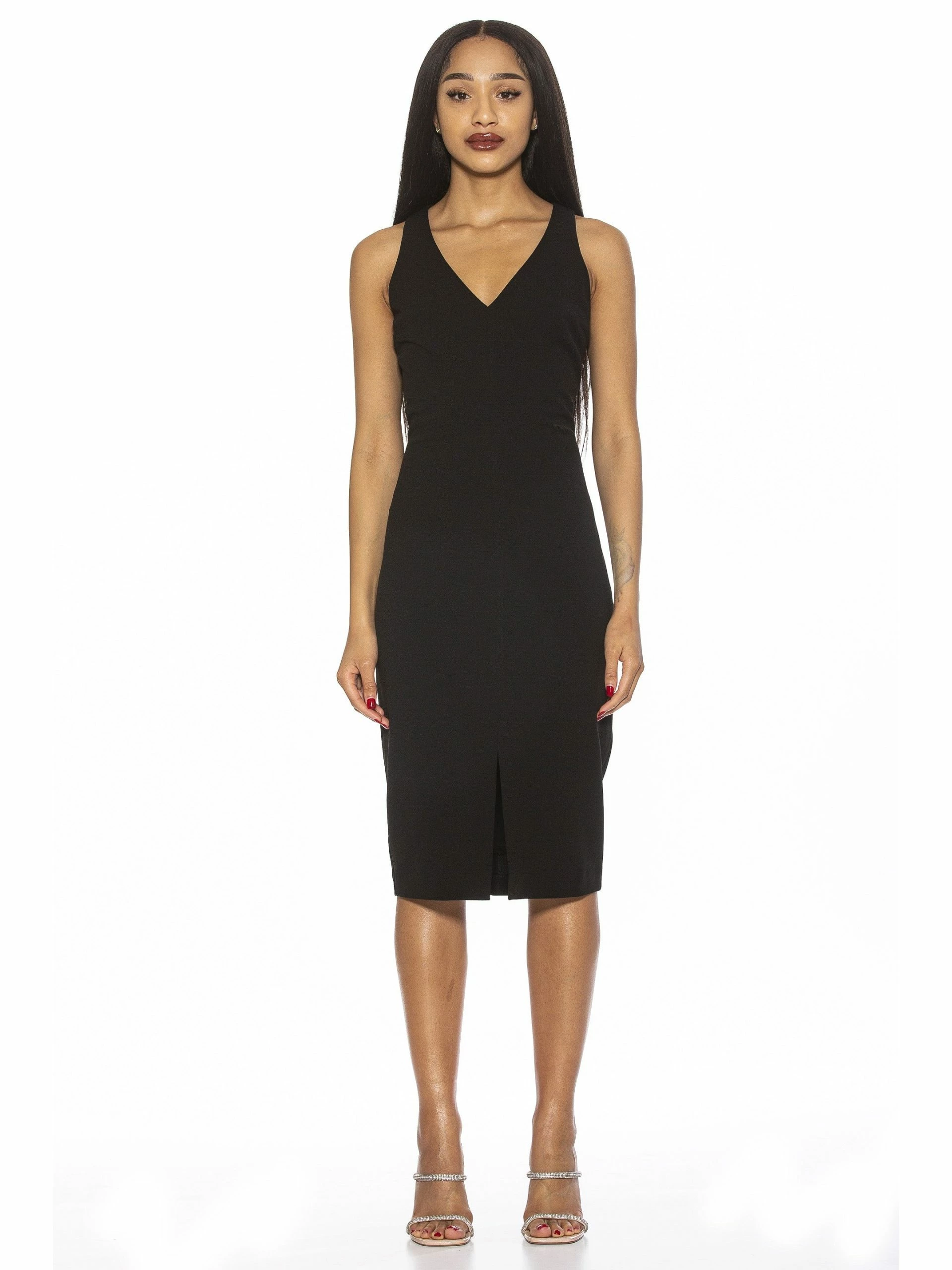 A sleeveless staple. The Taylor is a sleeveless, midi dress with a V neckline. It is fitted and flattering.